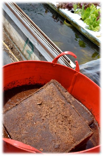 (Below) A block of coco coir soaked overnight in aquaponics water before mixing with the vermiculite we use in the potting mix.